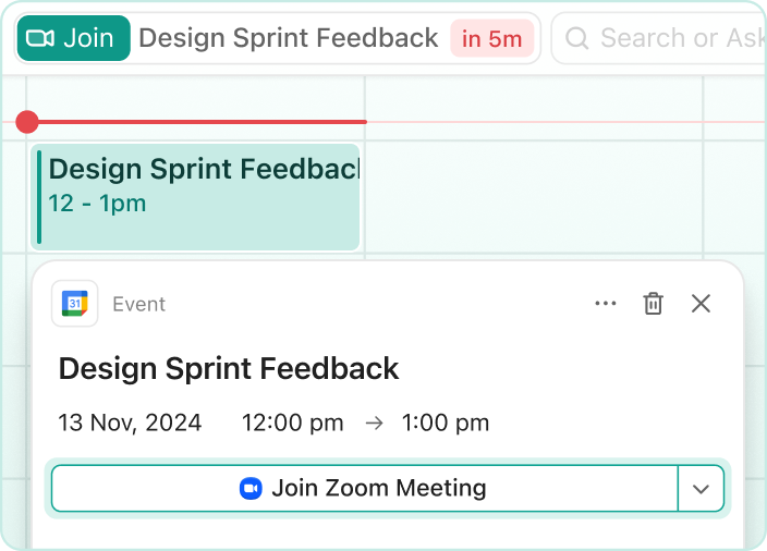 ClickUp se integra con herramientas como Zoom, Google Meet y Microsoft Teams. Cuando enlazas los eventos de tu calendario, ClickUp extrae automáticamente los detalles de la reunión y los añade a las tareas pertinentes. Incluso puedes unirte a las llamadas directamente desde tu entorno de trabajo.