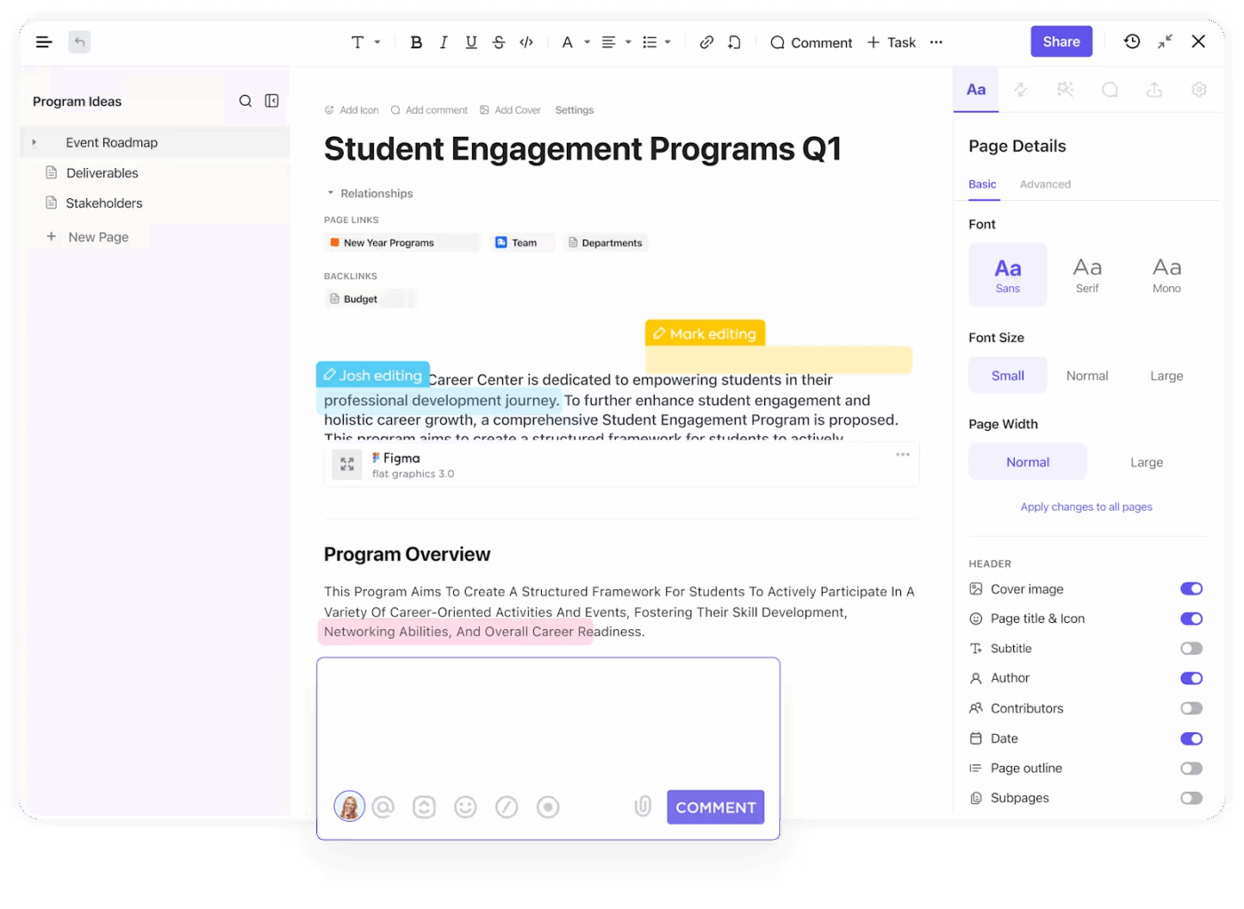 Cree una biblioteca viva con ClickUp Docs, donde puede crear wikis, POE y resúmenes de proyectos. Con ClickUp Docs, puede coeditar contenido en tiempo real y dejar comentarios directamente en el contexto con comentarios en línea. Los documentos no quedan al margen, sino que están conectados a tareas, proyectos y flujos de trabajo. Eso es lo que los mantiene actualizados.