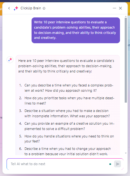 Utilisez ClickUp Brain pour générer des questions d'entretien avec des pairs afin d'évaluer les forces, les faiblesses et les compétences non techniques des candidats