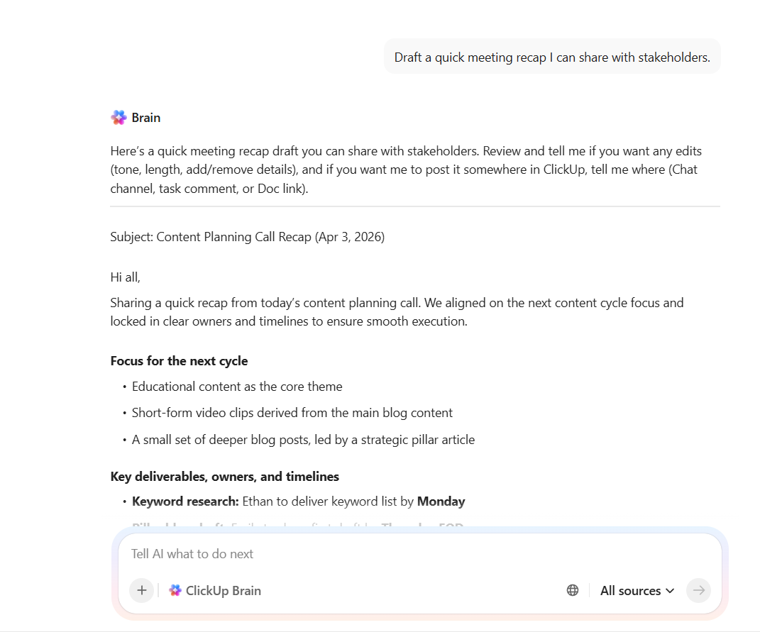 Vous devez encore boucler la boucle avec votre équipe ou vos parties prenantes. ClickUp Brain reprend ce même contexte de réunion et rédige :