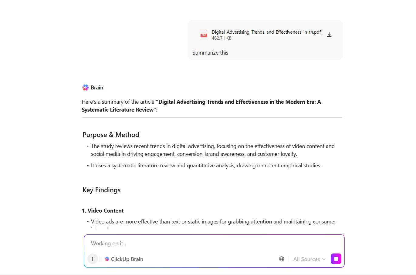 Anda juga dapat meminta ClickUp Brain untuk merangkum PDF dan dokumen yang tidak ada di ruang kerja Anda.