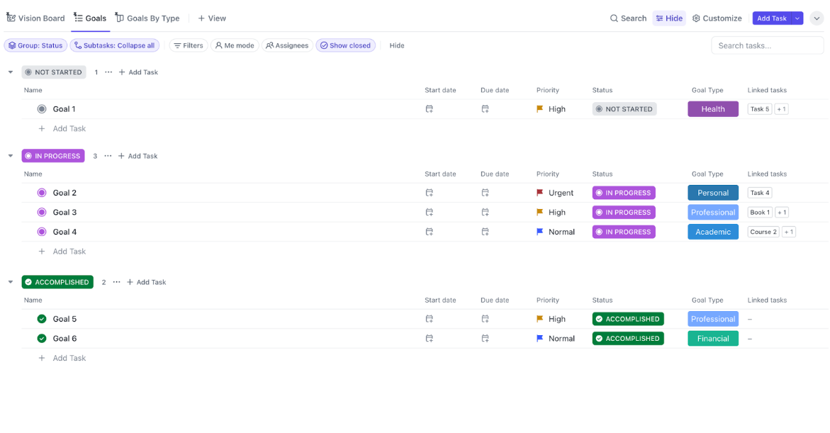 Iniziamo con gli Obiettivi di ClickUp. Ti aiuta a visualizzare lo stato di avanzamento, suddividendo i progetti più grandi in attività cardine gestibili. Questa suddivisione facilita un approccio passo dopo passo per raggiungere l'obiettivo generale.