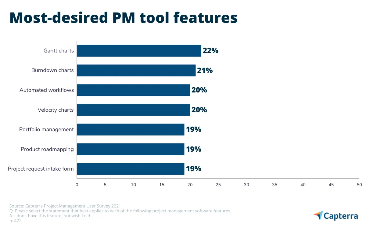 👀 Lo sapevate? Secondo il rapporto di ricerca di mercato sul software di project management di Capterra, il 22% degli utenti di software classifica i grafici Gantt come la funzionalità/funzione più desiderata, seguita a ruota dai grafici burndown.