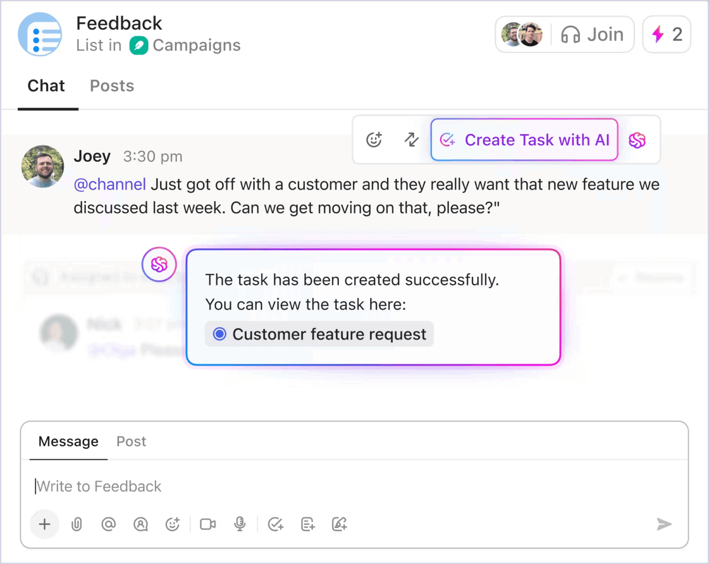 Puoi trasformare qualsiasi messaggio in un'attività con un solo clic, senza bisogno di copiare, incollare o riscrivere nulla in un'altra app. Ogni messaggio può essere collegato a un'attività, un documento o persino a una dashboard, in modo che nulla vada perso nei thread di conversazione.