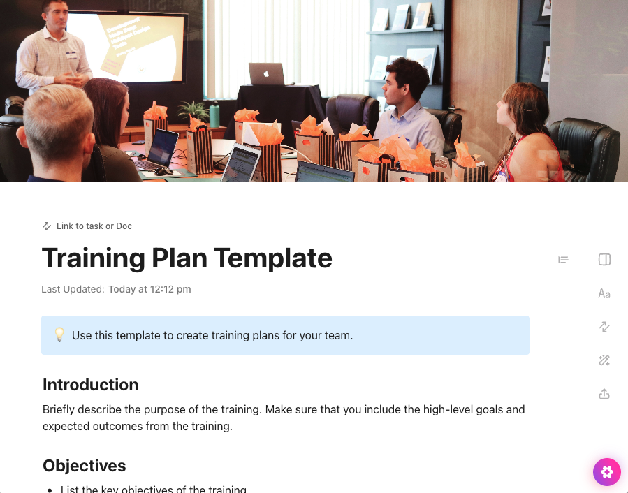 ClickUpのDocテンプレートなので、タスク、コメント、ドキュメントを簡単に追加することができ、サービス提供のトレーニング部分をプランニングし、実施する際に、より良いコラボレーションとトラッキングを行うことができます。ドキュメントが完成したら、PDFまたはHTMLファイルとしてエクスポートするか、印刷しましょう。 このテンプレートをダウンロードする