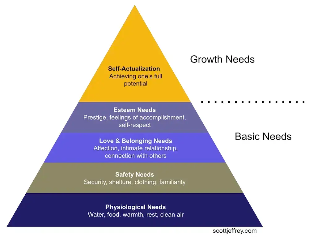 심리학자 아브라함 매슬로는 욕구계층설 이론에서 이러한 우선순위의 변화를 설명했습니다. 처음에는 사람들이 외적 동기, 즉 음식, 주거, 보안과 같은 기본적인 욕구에 집중합니다. 그러나 이러한 욕구가 충족되면 동기가 진화합니다.