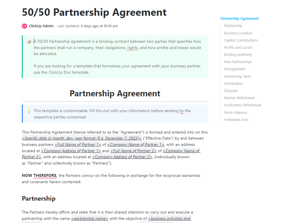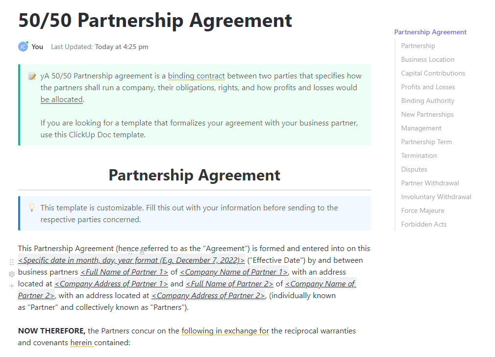 2. Het sjabloon voor de ClickUp 50/50 partnerschapsovereenkomst