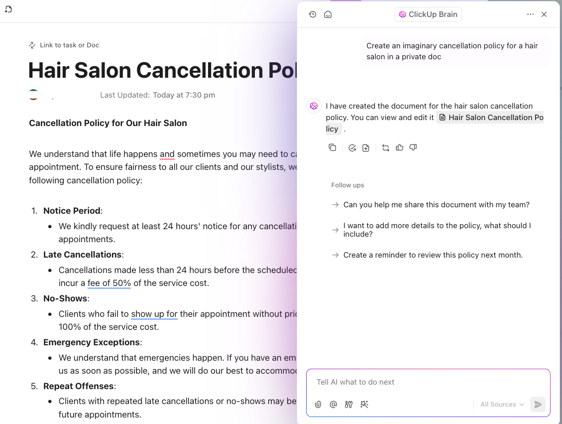 tip: Heeft u hulp nodig bij het opstellen van een annuleringsbeleid, maar weet u niet waar u moet beginnen? Vraag de ClickUp AI schrijver in ClickUp om u te helpen! Zo werkt het.