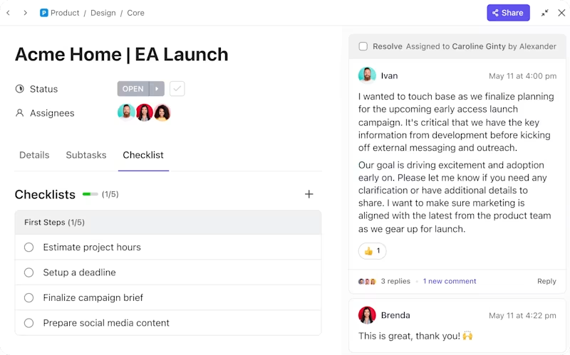 - Geïntegreerd met ClickUp: Goedkeuringen bijhouden, workflows beheren en samenwerken met belanghebbenden met behulp van verschillende innovatieve tools voor projectmanagement