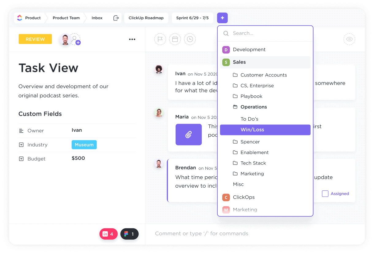 - Promocjaotwartą komunikację wokół zadań roboczych poprzez zintegrowane komentarze do zadań iClickUp Chatzapewniając, że wszyscy członkowie Teams są na tej samej stronie