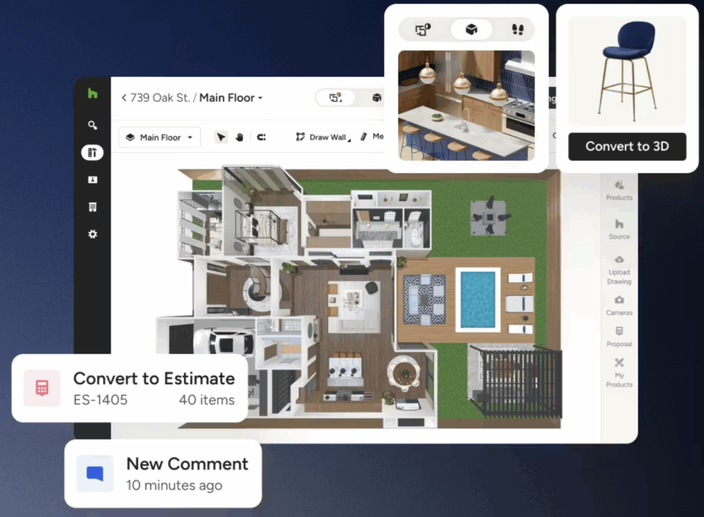 - Aproveite um espaço colaborativo onde os clientes podem aprovar acessórios, pisos e cores de tinta, com acompanhamento do orçamento que é atualizado automaticamente