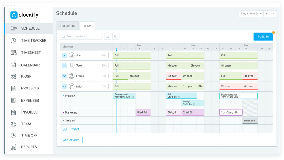 É aí que o Clockify ajuda. É um software de controle de tempo simples e sem complicações que oferece visibilidade sobre como sua equipe trabalha. Com seus relatórios visuais claros e painel intuitivo, você pode equilibrar as cargas de trabalho e garantir o uso eficiente de seus recursos humanos.
