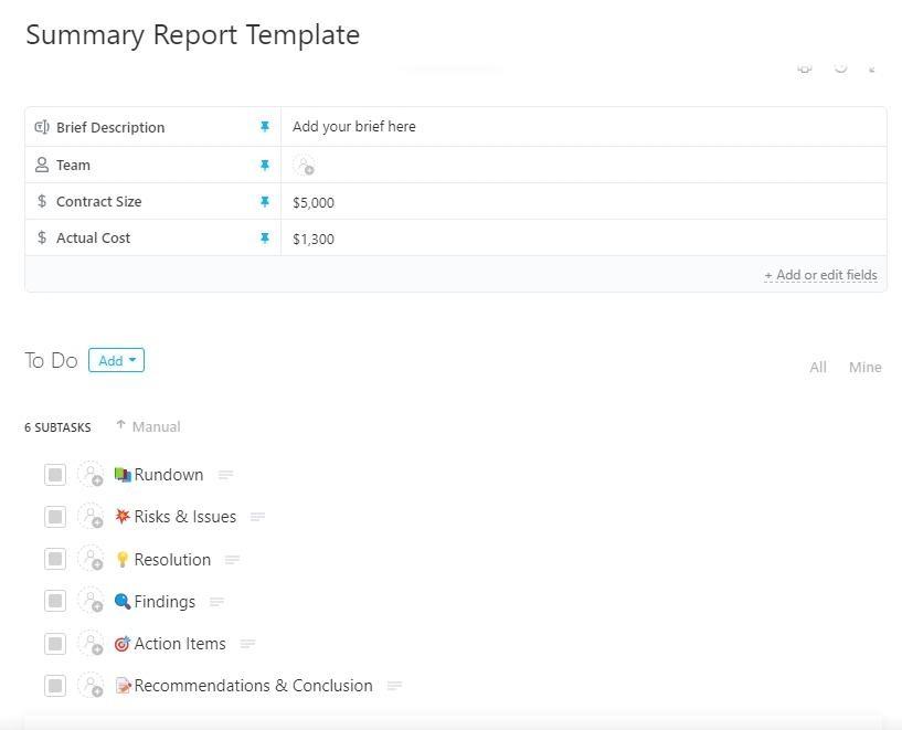 O modelo de relatório resumido do ClickUp funciona bem quando as partes interessadas desejam primeiro um resumo com informações importantes, com a opção de aprofundar os detalhes. Ele ajuda a manter o relatório conciso, ao mesmo tempo em que acompanha o trabalho subjacente e as atualizações ao longo do tempo.