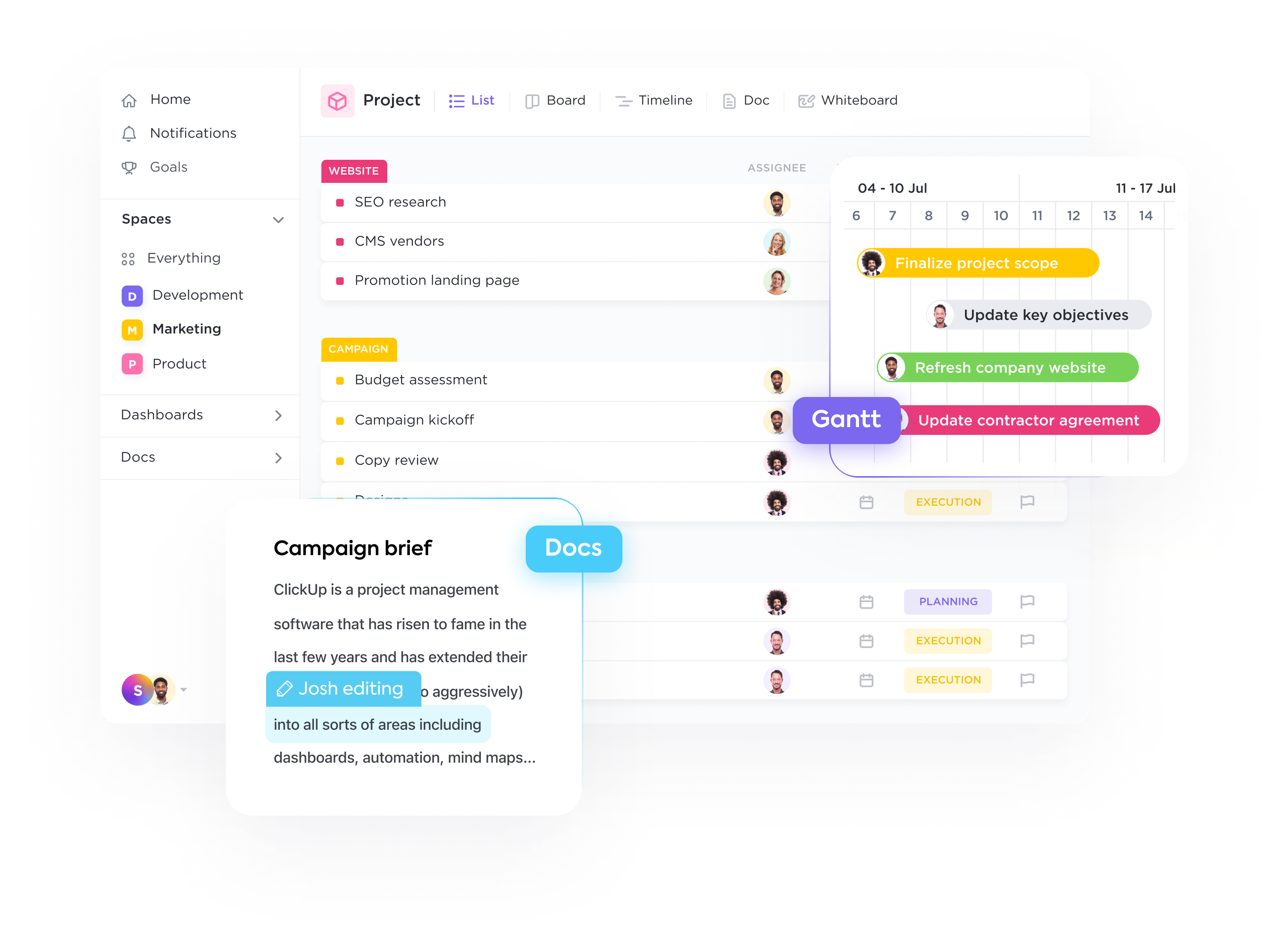 Keep everyone on the same page from brainstorm to launch. Collaborate seamlessly across marketing workstreams with ClickUp's Docs, Whiteboards, and Proofing tools that keep every member of your team in sync every step of the way.
