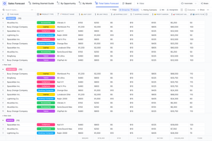 - Custom Views: Open 4 different views in different ClickUp configurations, such as the Total Sales Forecast, Getting Started Guide, By Opportunity, and By Month so that all the information is easy to access and organized