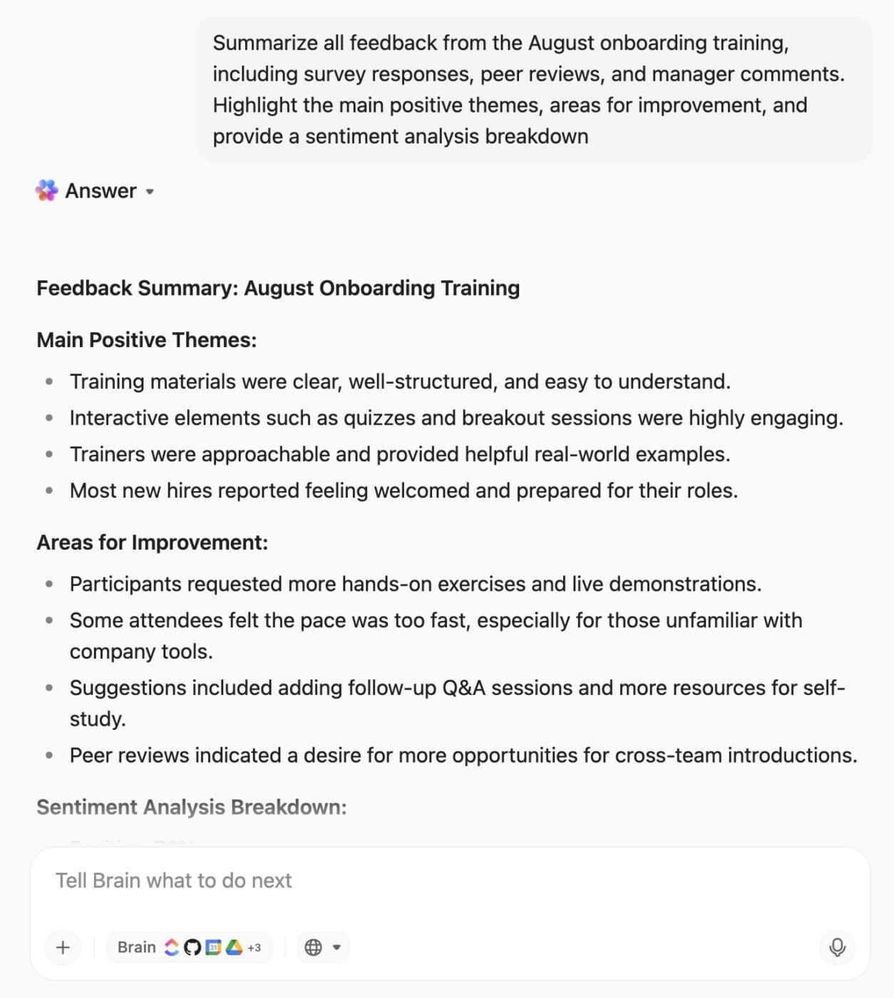 ด้วย ClickUp BrainGPT คุณสามารถรวบรวมความคิดเห็นจากแหล่งข้อมูลต่าง ๆ ได้โดยอัตโนมัติ เช่น แบบสอบถามหลังการฝึกอบรม, การประเมินจากเพื่อนร่วมงาน, และการประเมินจากผู้จัดการ และสรุปเป็นสรุปที่สามารถนำไปใช้ได้เพียงครั้งเดียว การวิเคราะห์ความรู้สึกที่ติดตั้งไว้ในระบบจะเน้นให้เห็นถึงแนวโน้มของความคิดเห็นที่เป็นบวก, เป็นกลาง, และเชิงลบ ทำให้คุณสามารถมองเห็นจุดแข็งและจุดที่ต้องปรับปรุงได้ในทันที