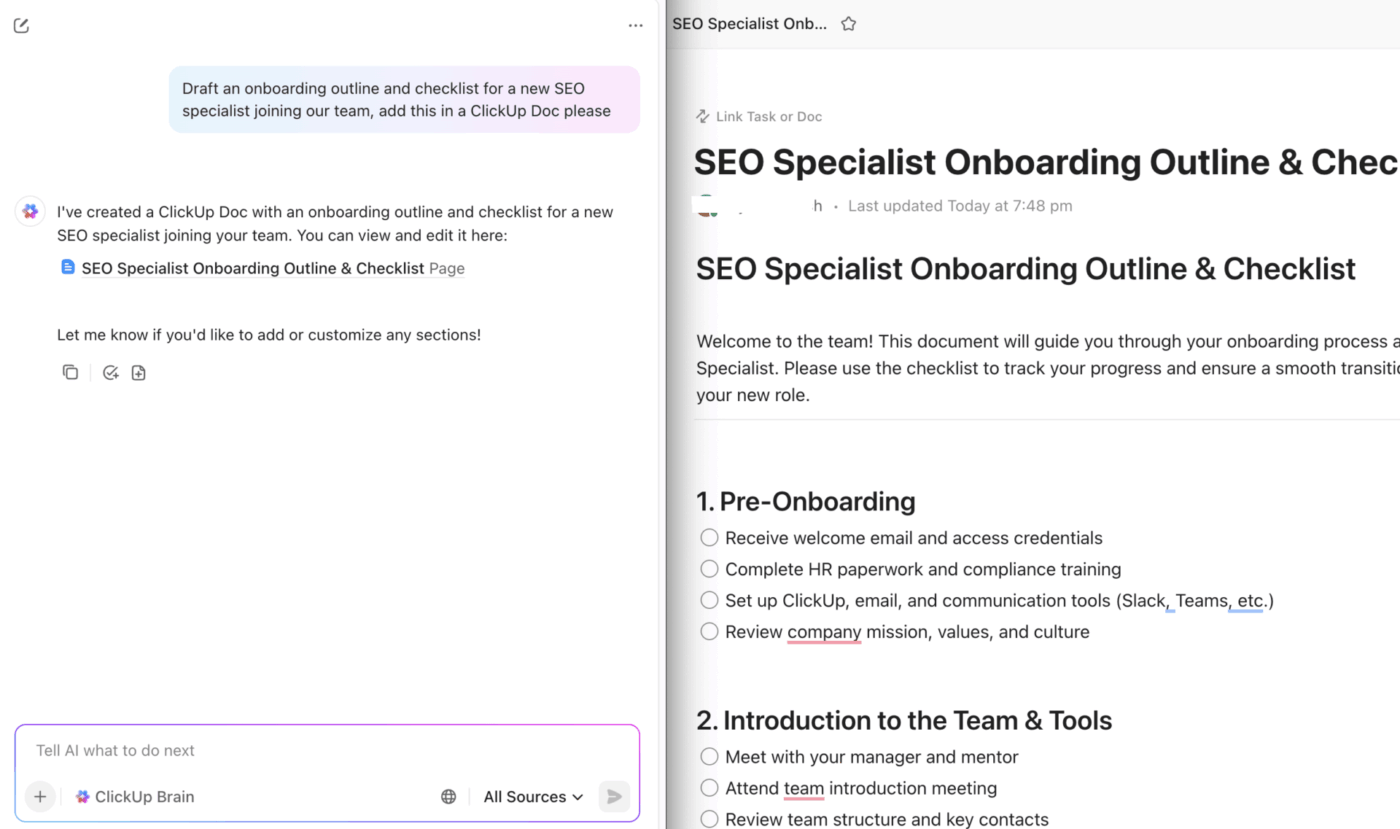 ClickUp Brain, เครื่องมือปัญญาประดิษฐ์อัจฉริยะของแพลตฟอร์ม, ทำให้การสร้าง, สรุป, และวิเคราะห์คำแนะนำกลายเป็นเรื่องง่าย ไม่ว่าคุณจะกำลังตรวจสอบการฝึกอบรมหรือรวบรวมคำแนะนำจากเพื่อนร่วมงาน, ClickUp Brain ก็สามารถสกัดข้อมูลสำคัญได้ทันที, ไฮไลต์สิ่งที่ต้องทำ, และเสนอขั้นตอนต่อไปได้