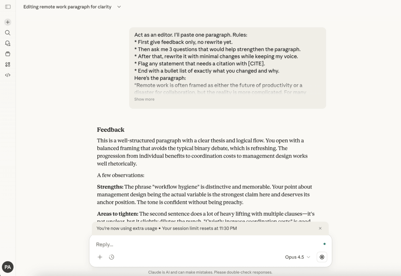 แทนที่จะขอให้โคล้ดเขียนเนื้อหาให้คุณ ให้ใช้โคล้ดเป็นคู่คิดในการให้ข้อเสนอแนะระหว่างการแก้ไขงาน แบ่งปันร่างย่อหน้าและขอข้อเสนอแนะเฉพาะเจาะจงเกี่ยวกับความแข็งแกร่งของข้อโต้แย้ง ความชัดเจน หรือการบูรณาการหลักฐาน โคล้ดสามารถระบุจุดที่เหตุผลของคุณอาจทำให้ผู้อ่านสับสนหรือจุดที่ต้องการการสนับสนุนเพิ่มเติมเพื่อเสริมความแข็งแกร่งให้กับข้ออ้างของคุณ
