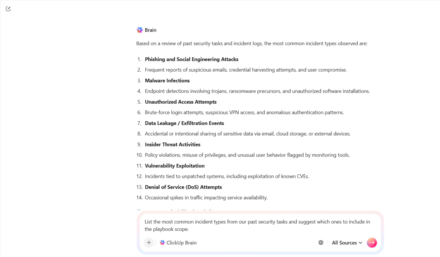 ตัวอย่างเช่น สมมติว่าทีมรักษาความปลอดภัยของคุณจัดการกับเหตุการณ์การหลอกลวงและการเข้ายึดบัญชีหลายครั้งในไตรมาสที่ผ่านมา แทนที่จะตรวจสอบแต่ละกรณีด้วยตนเอง คุณสามารถให้ ClickUp Brain ช่วยได้: 'แสดงรายการประเภทเหตุการณ์ที่พบบ่อยที่สุดจากงานรักษาความปลอดภัยที่ผ่านมาของเรา และแนะนำว่าควรรวมประเภทใดไว้ในขอบเขตของคู่มือปฏิบัติการ'