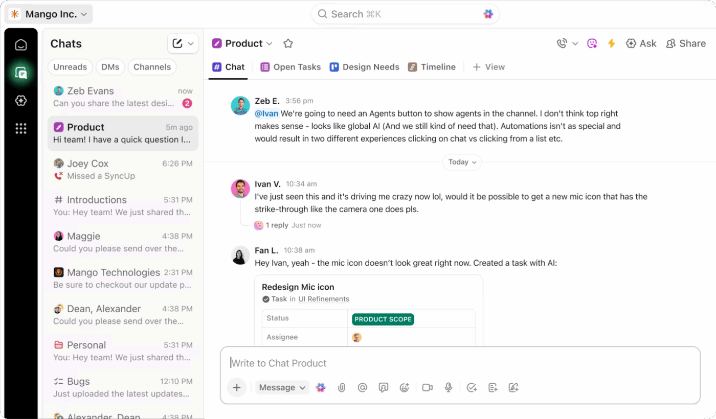 ClickUp Chatมอบช่องทางเฉพาะที่เชื่อมโยงกับบริบทให้คุณ ซึ่งช่วยให้การสื่อสารเกี่ยวกับเหตุการณ์ต่าง ๆ เป็นไปอย่างตรงจุด มองเห็นได้ชัดเจน และติดตามได้ง่าย