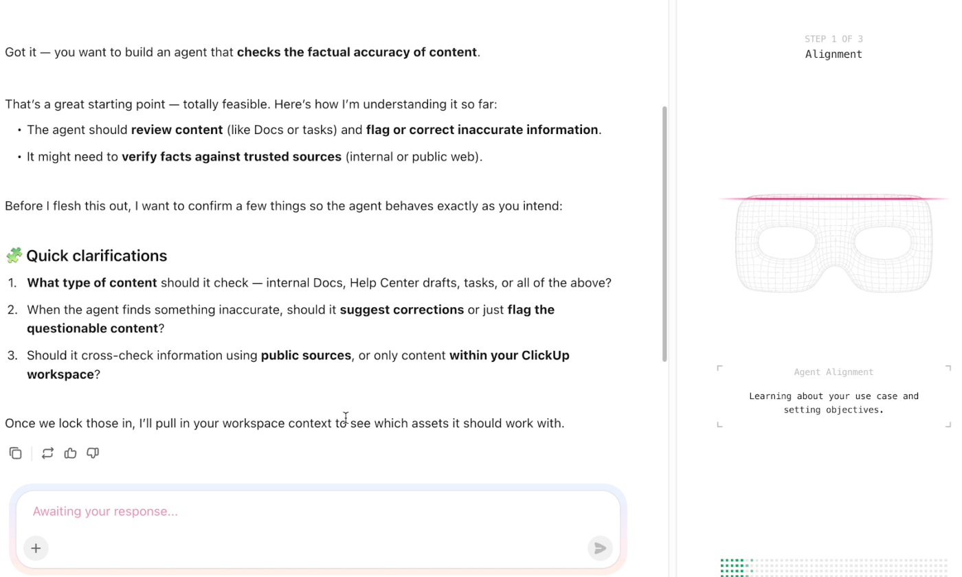 ClickUp AI Agentsช่วยลดช่องว่างนั้นลง พวกเขาสังเกตกิจกรรมต่างๆ ในงาน ฟิลด์ และเวิร์กโฟลว์ จากนั้นดำเนินการตามตรรกะที่คุณกำหนด ซึ่งทำให้พวกเขามีความเกี่ยวข้องสูงเมื่อคุณทดสอบและนำไปใช้ในแผนปฏิบัติการของคุณ