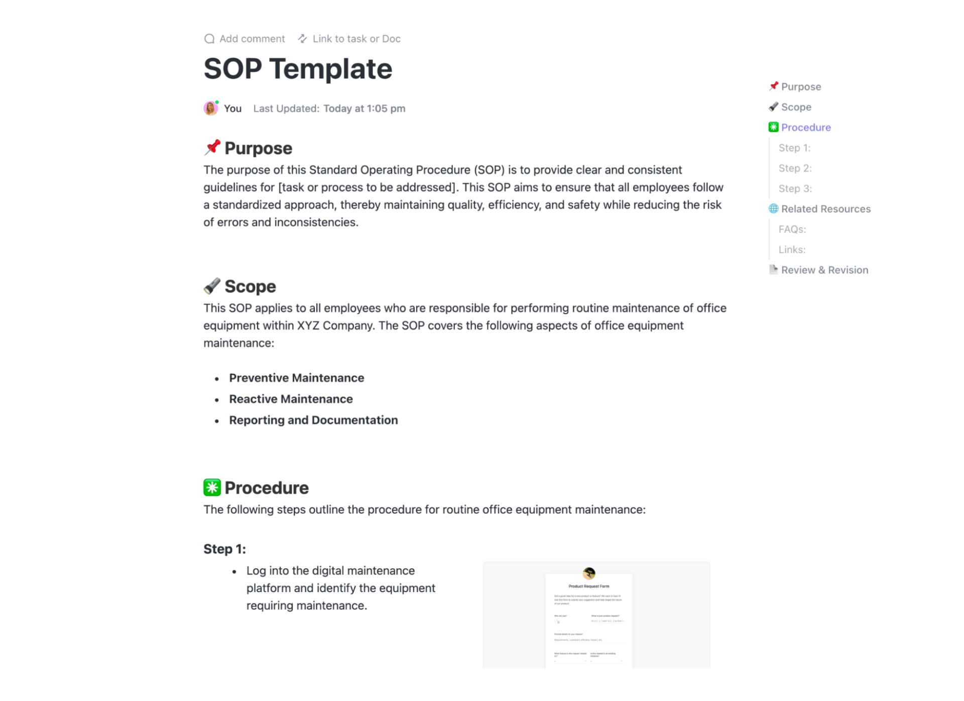 Amaç, kapsam, prosedürler, beklentiler ve ölçülebilir sonuçlar için size özel SOP bölümleri sunar. Ayrıca, görev atamaları, son teslim tarihi, durum izleme ve Özel Alanlar ile saniyeler içinde bir ş Akışı oluşturabilirsiniz.