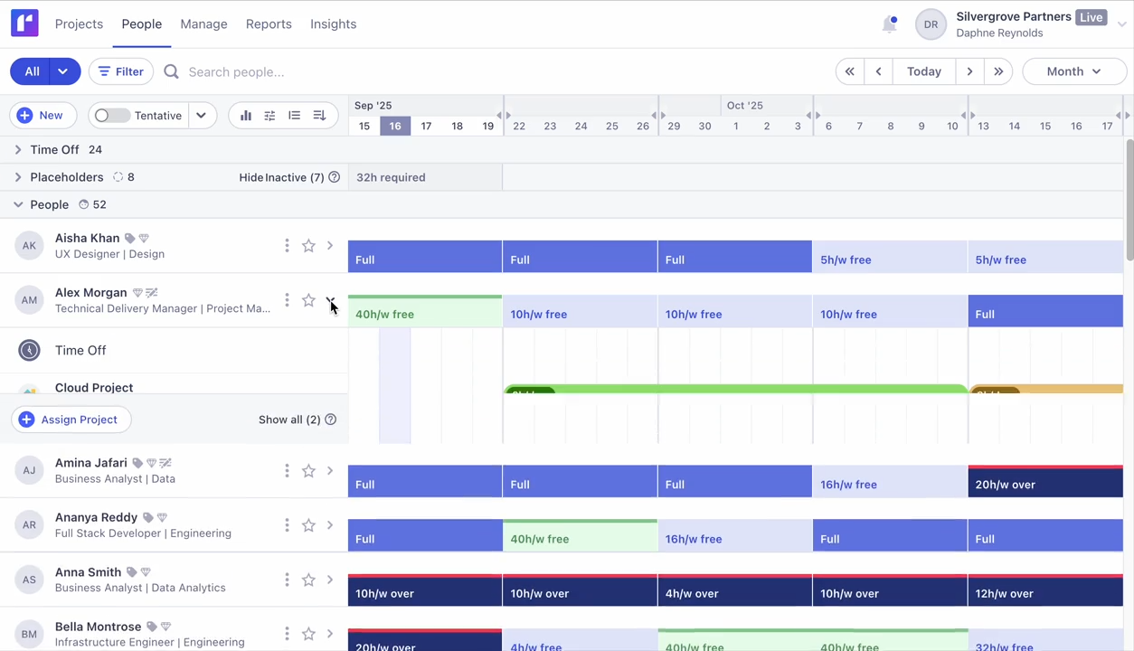 Bạn có thể xem khối lượng công việc theo người được giao trong một phạm vi thời gian nhất định, so sánh với sức chứa của từng người và nhanh chóng điều chỉnh lại bằng cách chuyển giao quyền sở hữu hoặc điều chỉnh dòng thời gian. Tính năng này đặc biệt hữu ích khi một dự án trông có vẻ ổn định khi xem riêng lẻ, nhưng cùng một vài người lại đang âm thầm đảm nhận ba ưu tiên khác song song.