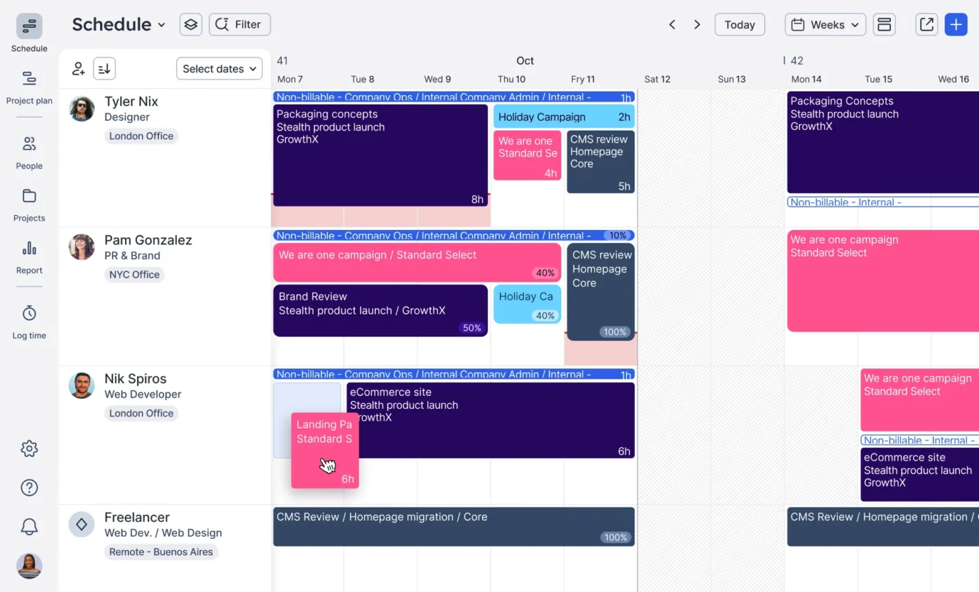 - Lịch trình nguồn lực: Xem sức chứa của nhóm và lên lịch công việc cho các dự án, tích hợp với dòng thời gian dự án