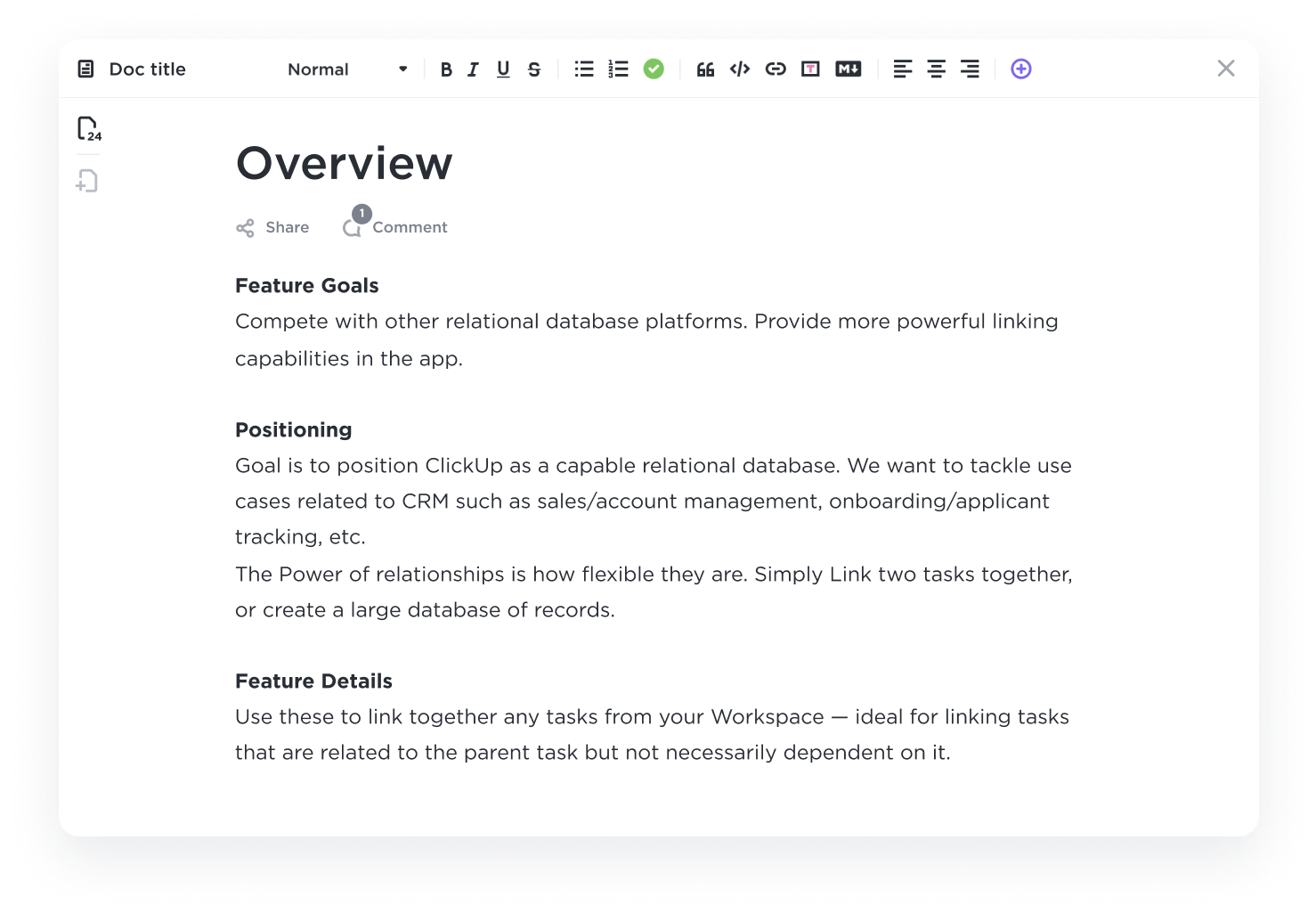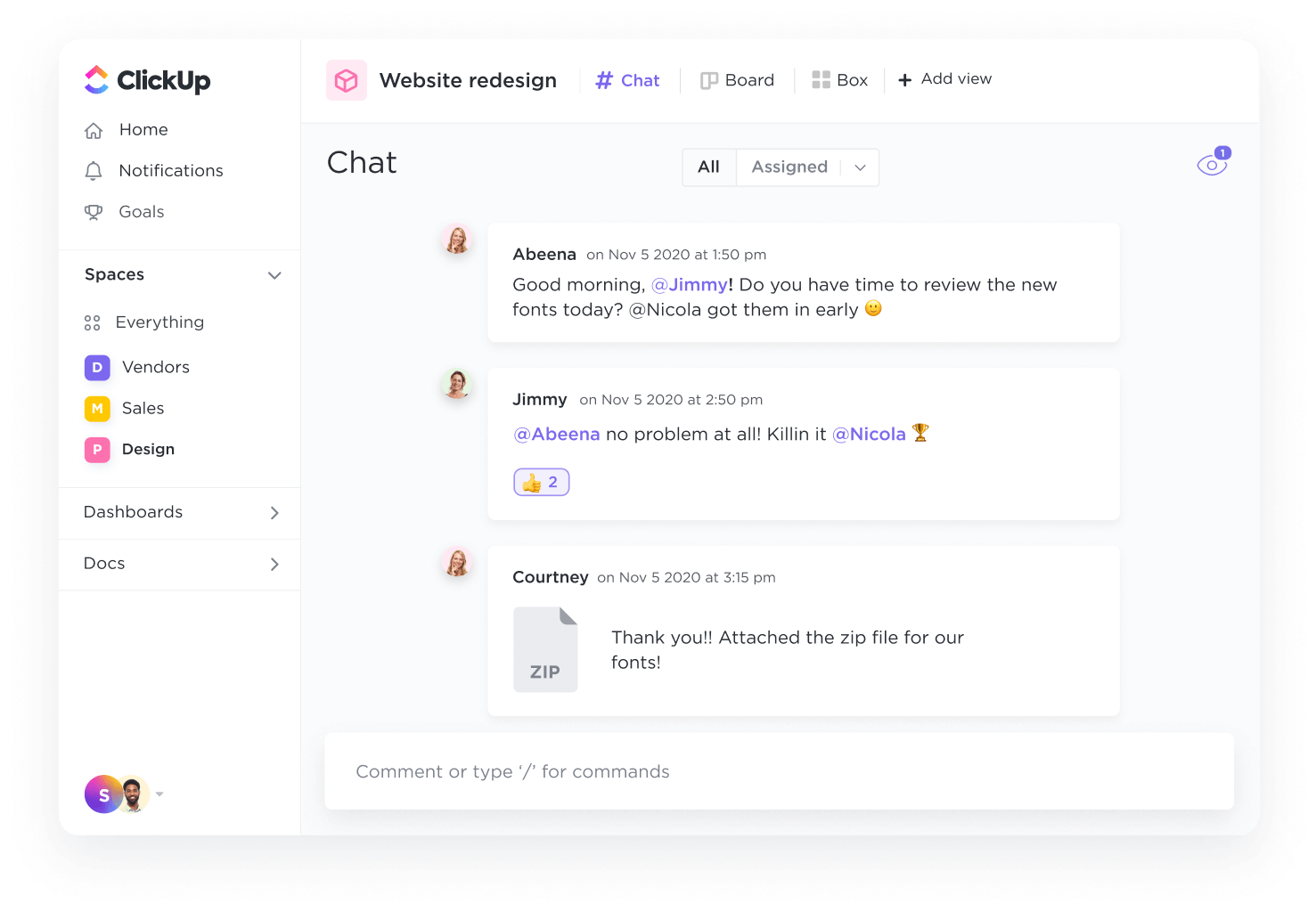 No more endless scrolling for old conversations about a Notion project. With linked chat history, project conversations live inside relevant ClickUp tasks so project context is right in front of you.