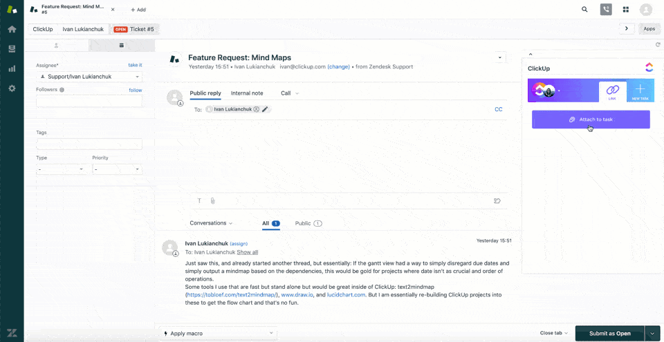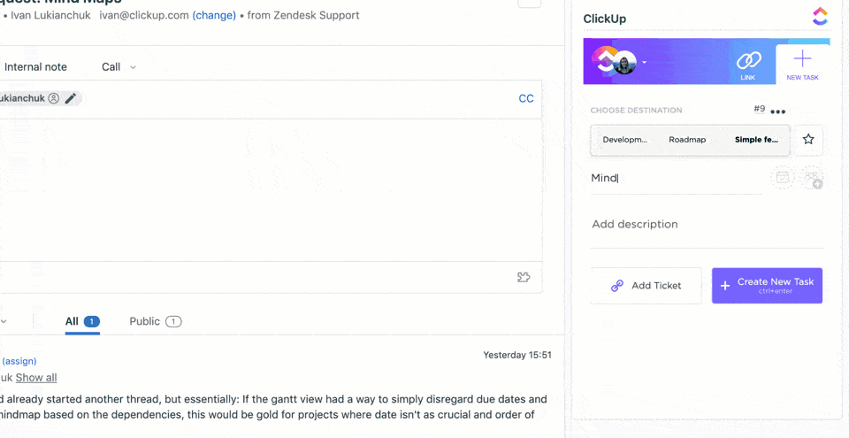 Easily convert any support ticket into a ClickUp task with just one click, including all relevant information and attachments.