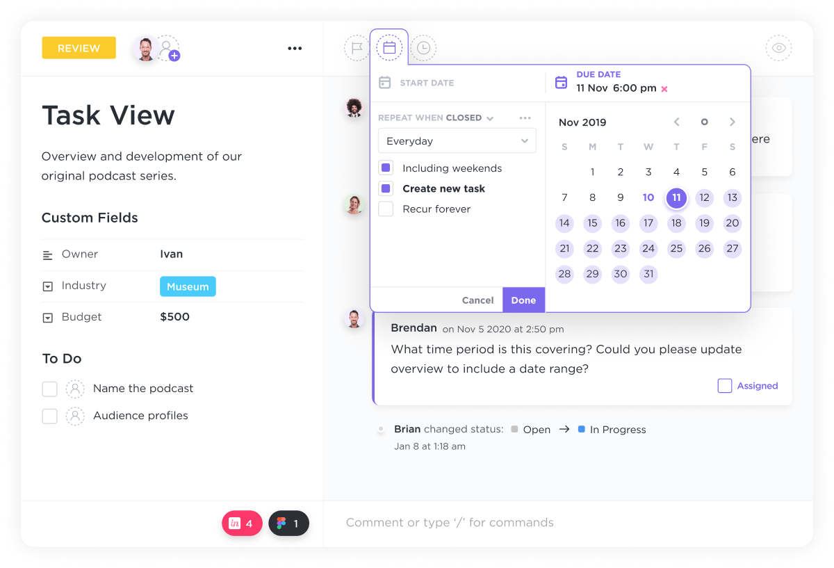 Create recurring tasks for regular accounting processes, from invoices to regular meetings. Schedule tasks to recur at any frequency, such as daily or biweekly, or when their status changes.