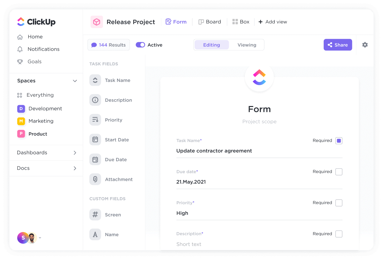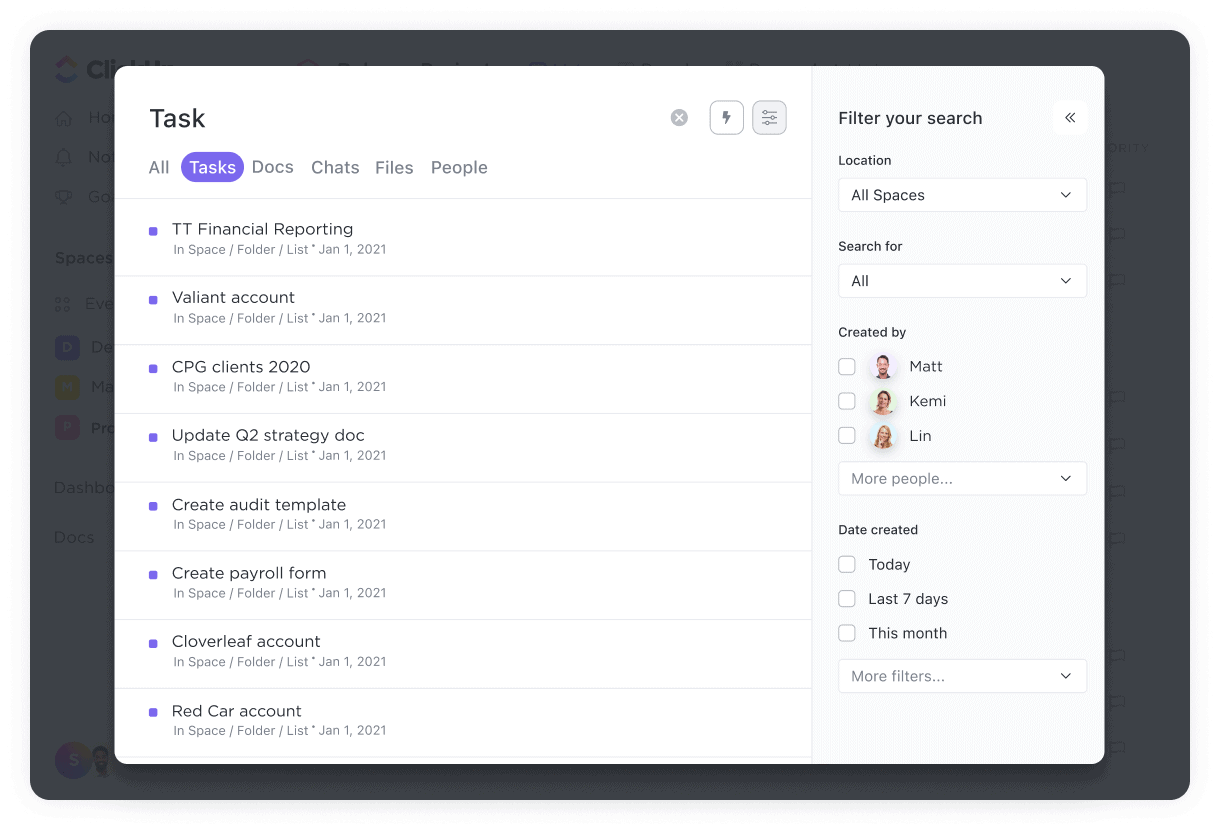 Organize your work from general to specific using ClickUp's searchable, multi-level Hierarchy. Arrange work into multiple levels to track customers, invoices, reports, and more.