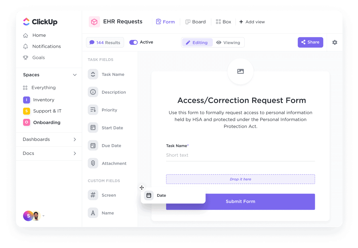 Create intake forms to bring update requests for EHRs and other clinical data directly into ClickUp. Automate contract and SLA processes for smooth and efficient hand-offs.