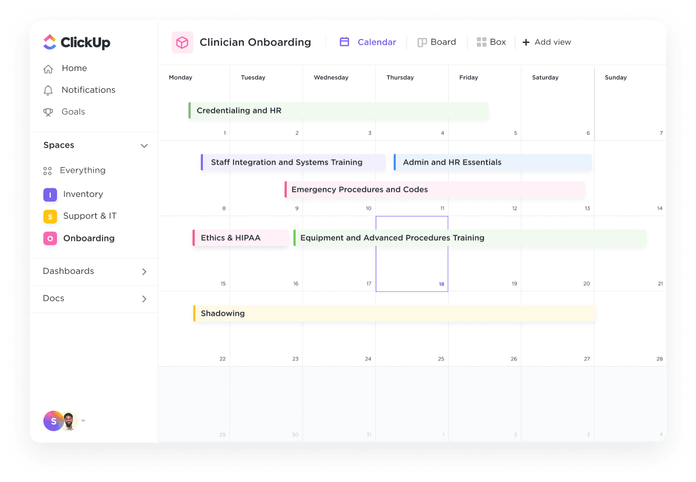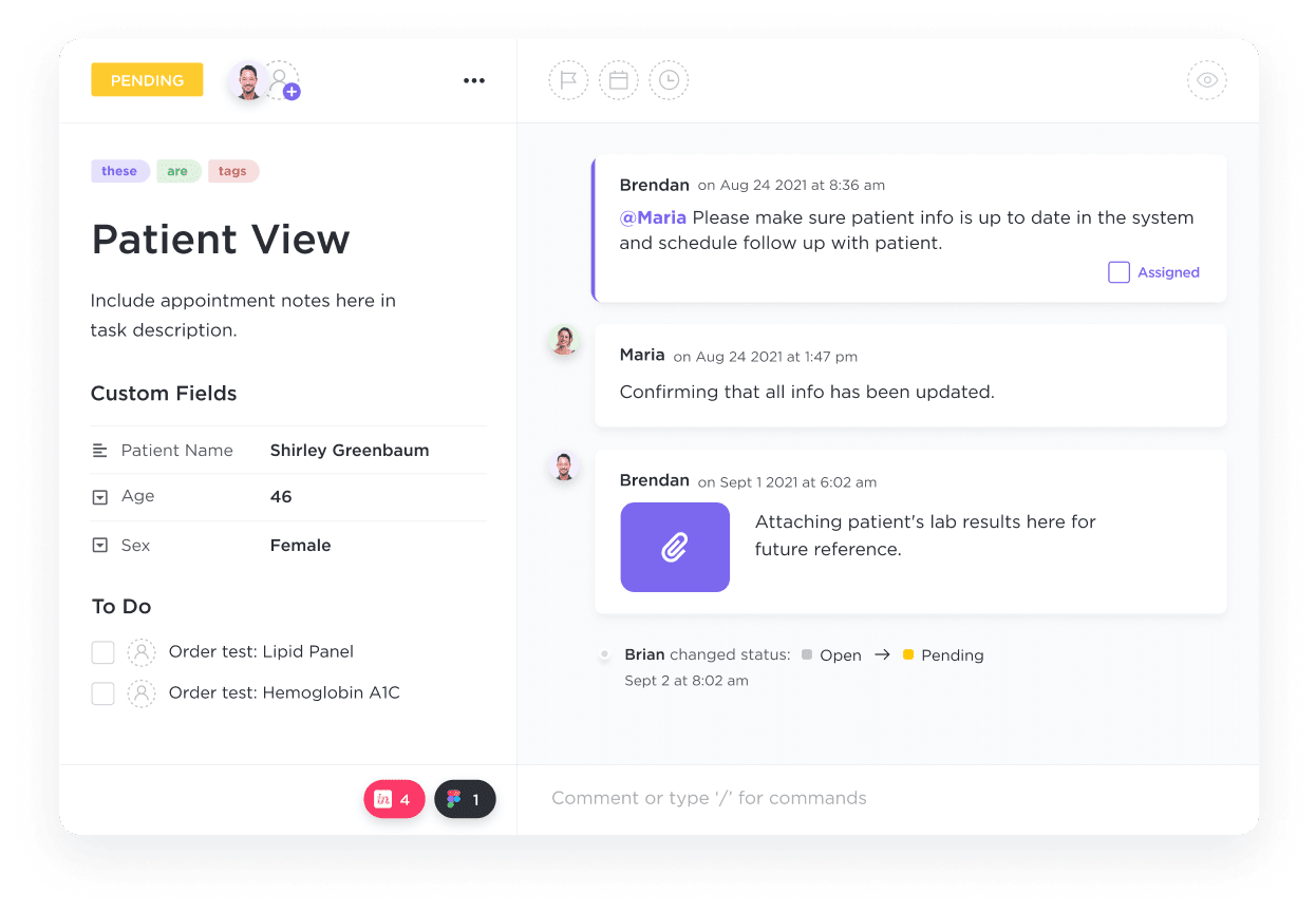 Create real-time cross-departmental communication channels directly in ClickUp. Connect IT to caregivers; loop in legal for contract reviews, streamline intake requests, and more.