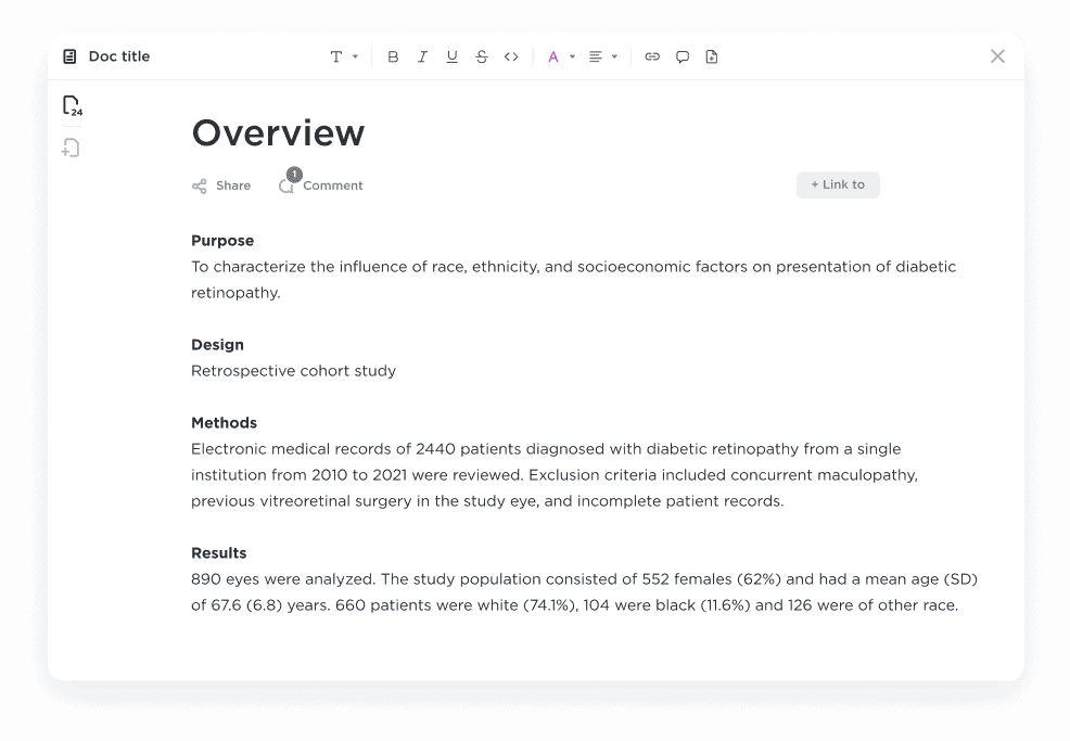 Create meeting notes, outlines, and publications with ClickUp Docs. Link tasks, attachments, and embed to easily track online resources from PubMed, Google Scholar, Scopus, and more.