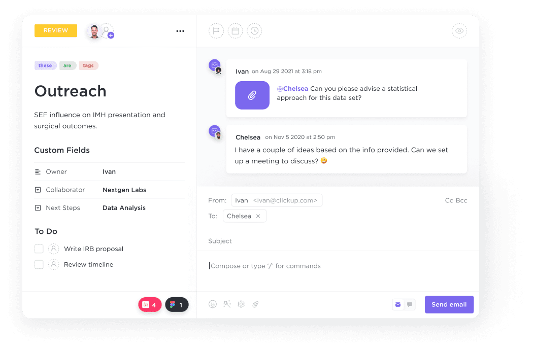 Send and receive emails anywhere in ClickUp. Create tasks from emails, set up automations, attach emails to any task, and more.