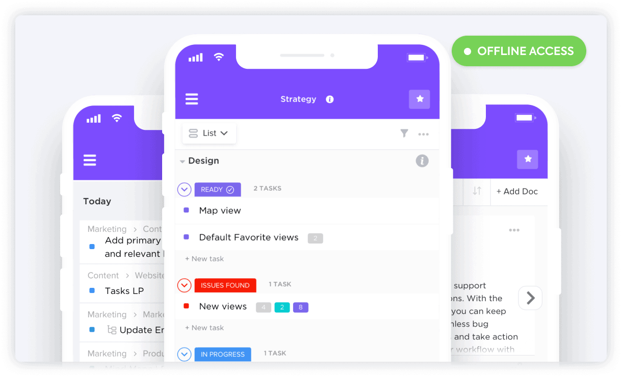 Work offline from anywhere with your desktop or mobile device without worrying about your work getting lost. Tasks in ClickUp sync as soon as you get a connection.