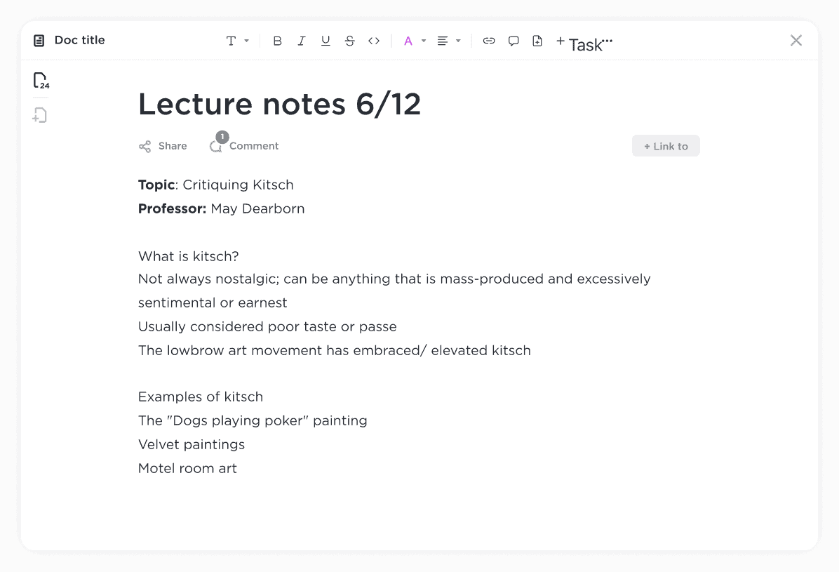 Breeze through essays and never lose track of notes with ClickUp Docs. Format your writing with tons of editing features, organize your work by linking tasks within Docs, and embed resources for quick reference.